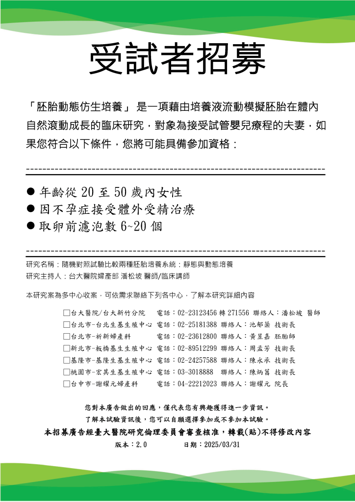 If you are in Taiwan and are considering IVF treatment, you can refer to the following latest research<Dynamic Bionic Culture of Embryos> . You can contact the following units for detailed information and register to participate in this study. 如果您在台灣並正準備考量IVF療程,可以參考下列最新研究<胚胎動態仿生培養>的訊息,可依需求聯絡下列單位了解詳細訊息,並登記參與本次研究。